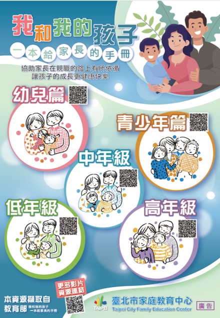 二、為陪伴家長與孩子共同經營學校及家庭生活,教育部邀集專家學者編製《我和我的孩子-一本給家長的手冊》親職教育手冊(包含幼兒篇、國小低、中、高年級及青少年 篇),針對家有學前、國小及青少年階段孩子的家長,可能面對的親職課題,透過簡單易懂的條列式小提醒,協助家長輕鬆學習親職知能及技巧。