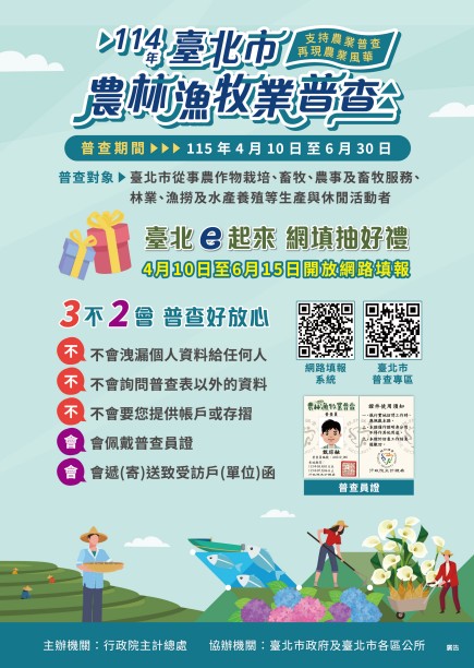 請支持農林漁牧業普查,普查員不會洩漏個人資料給任何人、不會詢問普查表以外的資料、不會要您提供帳戶或存摺、會佩戴普查員證、會遞(寄)送致受訪戶(單位)函。