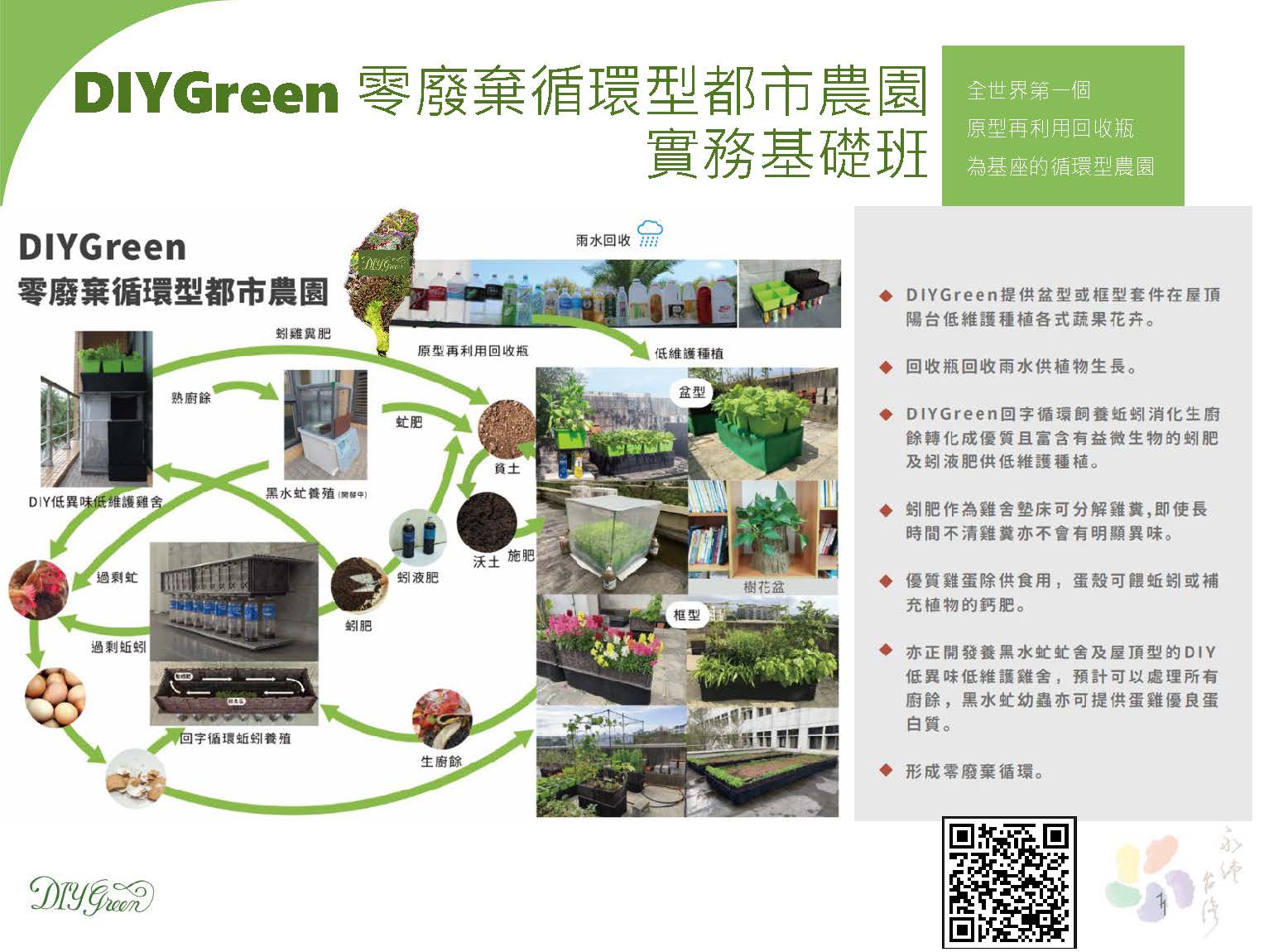 一、DIYGreen 循環型都市農園是全世界第一個以回收瓶為基座 的 DIY 循環型農園。可在水泥地上創造出綠地供種蔬果花 卉,適合從小孩至長者所有年齡層DIY施作;有關DIYGreen 單盆體驗班及DIYGreen盆型基礎班兩門課程,詳細課程訊 息及報名請至https://reurl.cc/krrY6n,檢附課程DM一 份。