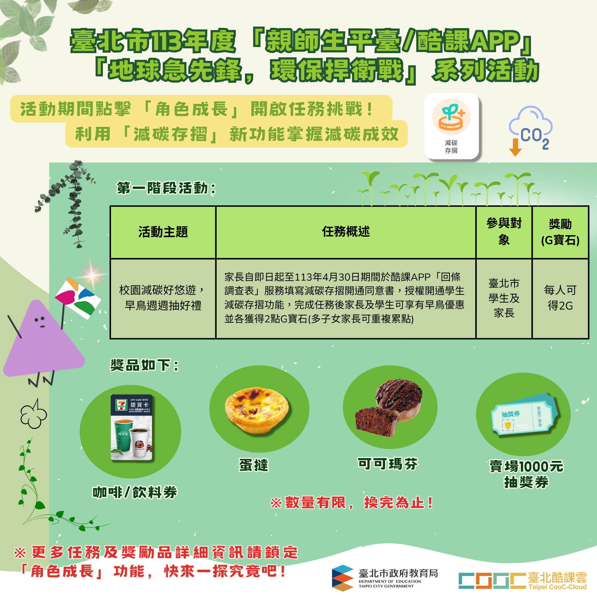 2、本局將於「親師生平臺/酷課APP」新增學生「減碳存 摺」功能(預計113年5月1日上線),學生持數位學生證 悠遊卡搭大眾運輸工具(捷運、公車、高鐵、臺鐵及 YouBike)後,即可累積減碳量,系統亦會加上大眾減 碳平均值提供參考,學生可精準掌握自身減碳成效, 同時提升其環保意識及培養環境永續觀念。