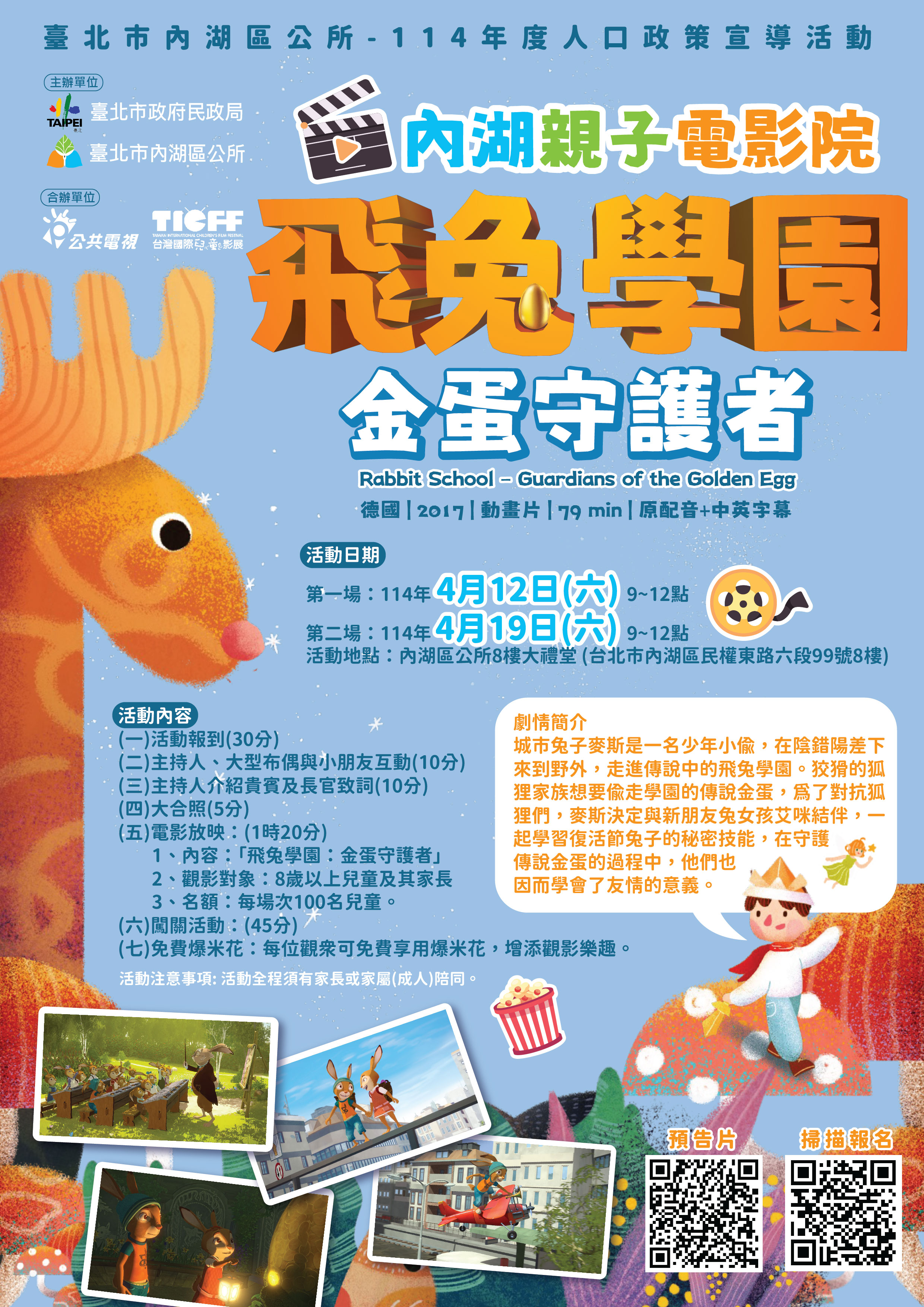 內湖親子電影院將於114年4月12日及4月19 日舉辦,邀請親子共同欣賞台灣國際兒童影展影片《飛兔 學園:金蛋守護者》,地點為內湖區公所8樓大禮堂(臺北市內湖 區民權東路6段99號8樓)。每場次限100組親子參加,活動中將舉行大型布偶互動、問答闖關及親子合作遊戲,並提供健達出奇蛋和免費爆米花,報名自即日起開放,額滿為止