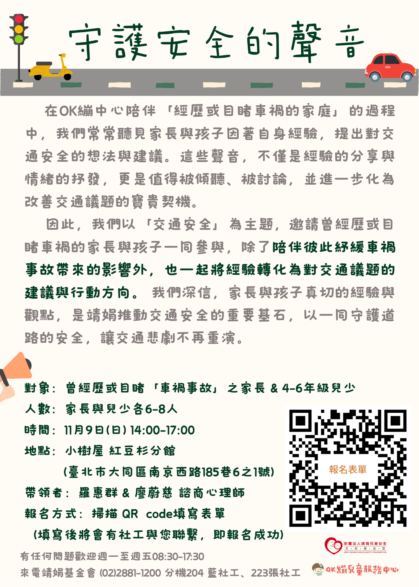 二、靖娟基金會OK繃兒童服務中心將於114年11月9日14時至17時辦理以「交通安全」為主題之團體活動,邀請曾經歷或目睹車禍之家長及兒少共同參與,期協助家長及兒少紓緩事故影響之餘,也能凝聚意見並討論交通環境的改善方向。