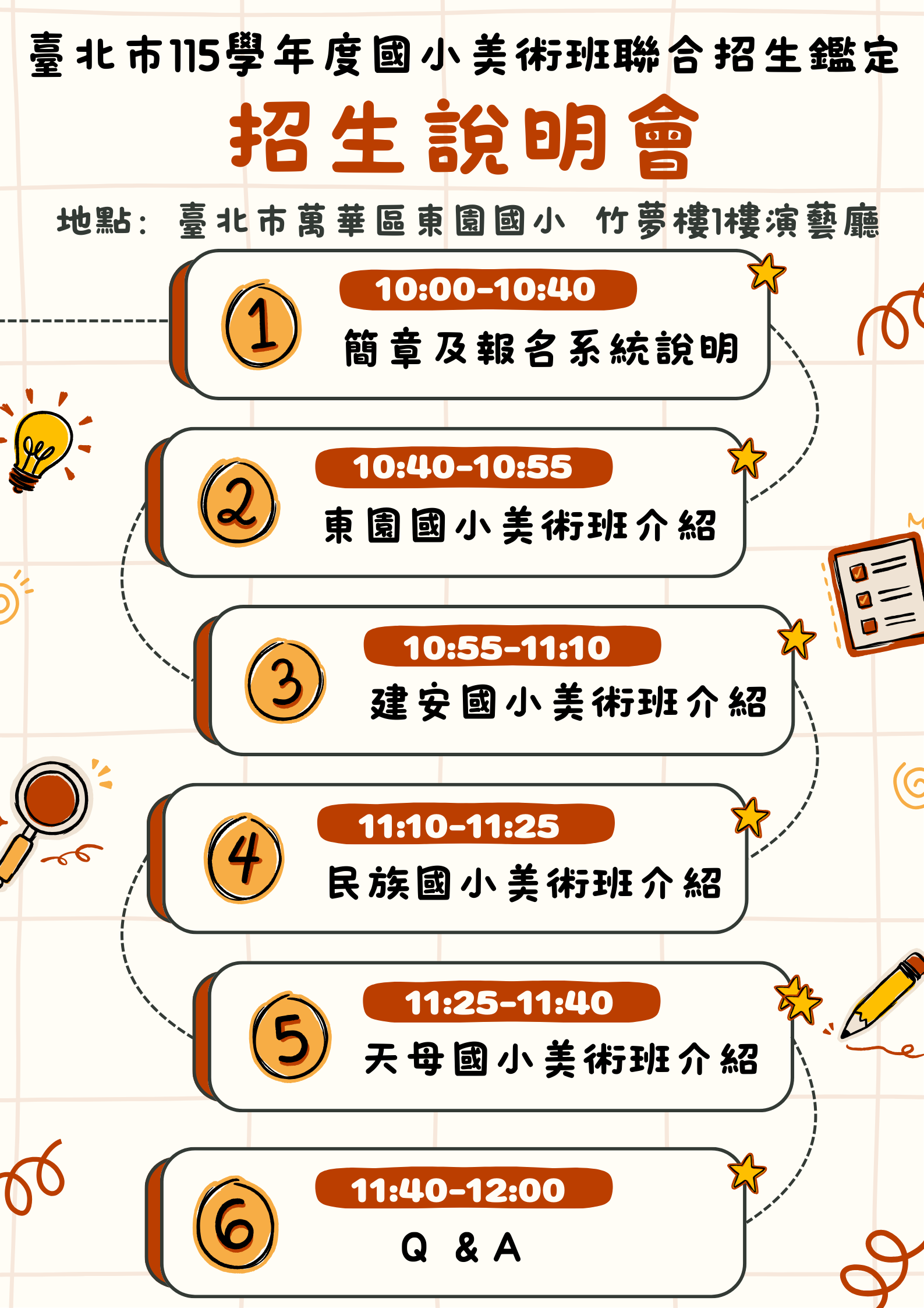 一、東園國小承辦臺北市115學年度國民小學藝術才能美術班招生鑑 定說明會。