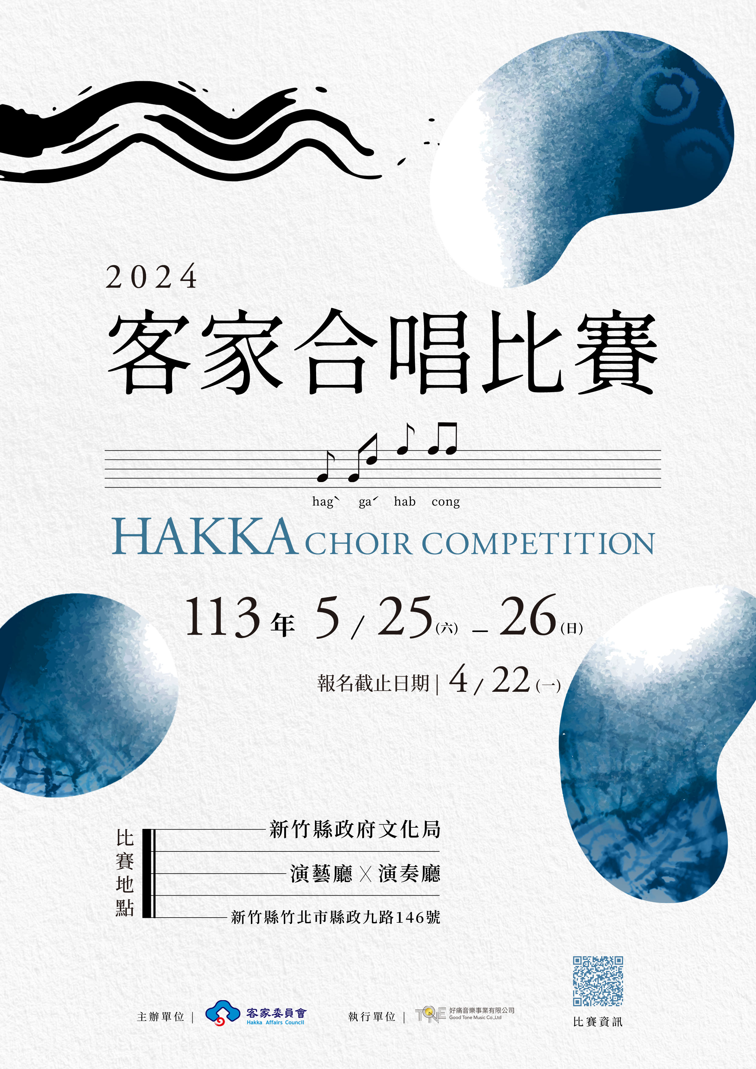 二、客家委員會為推動客家語言與文化永續傳承,訂於113年5 月25日至26日(星期六、日)假新竹縣文化局演藝廳及演 奏廳辦理旨揭賽事,比賽組別包括合唱類「兒少組」及 「青少組」、現代阿卡貝拉類「學生組」以及傳統山歌類 等,報名自即日起至113年4月22日(星期一)止。