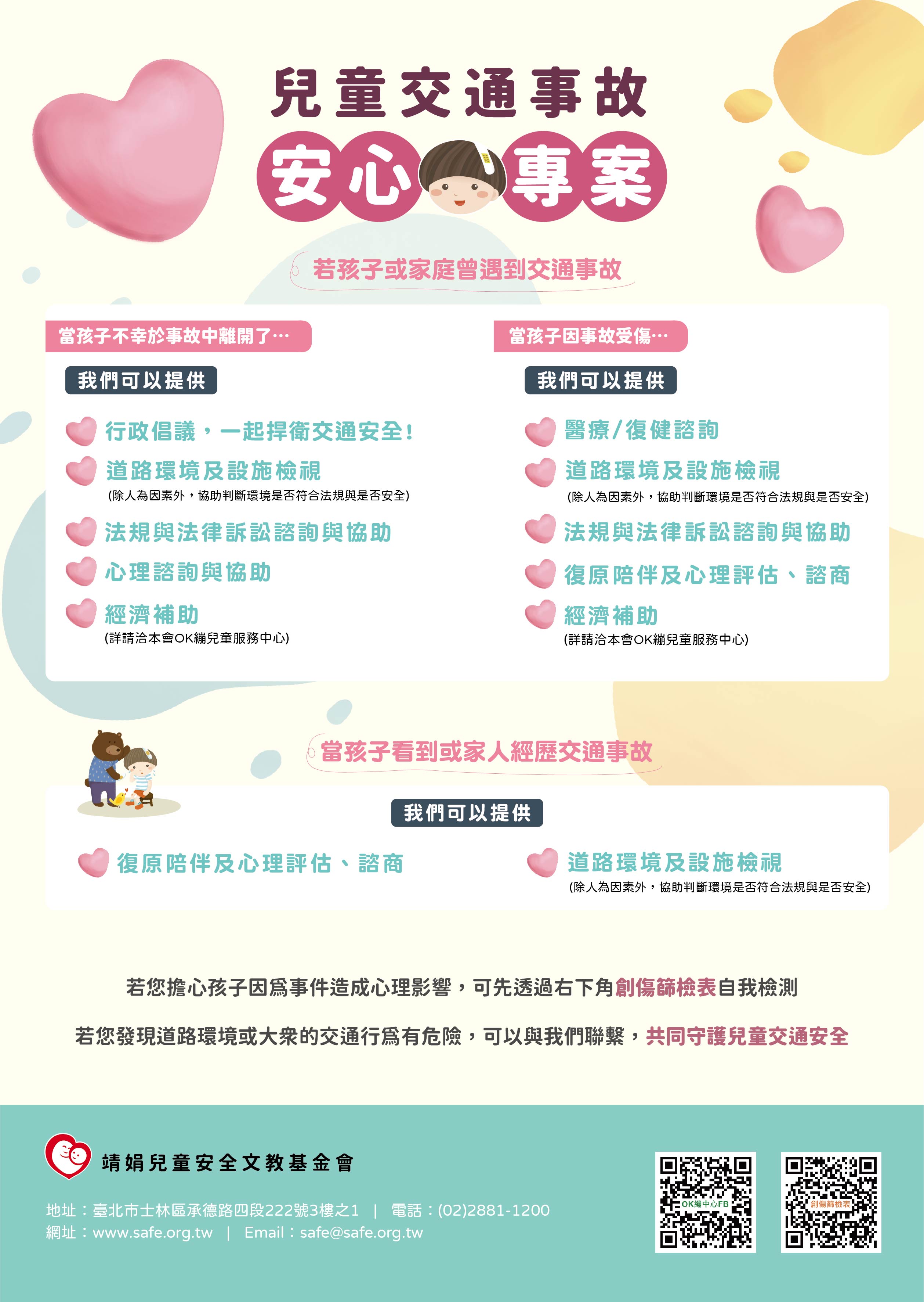 為協助兒少及其家庭面對交通事故後之問題及穩定就學, 靖娟基金會自110年開辦「兒少交通事故安心專案」,以經 歷交通事故之兒少為核心,提供法律、醫療、心理、環境 檢視與行政倡議之服務。