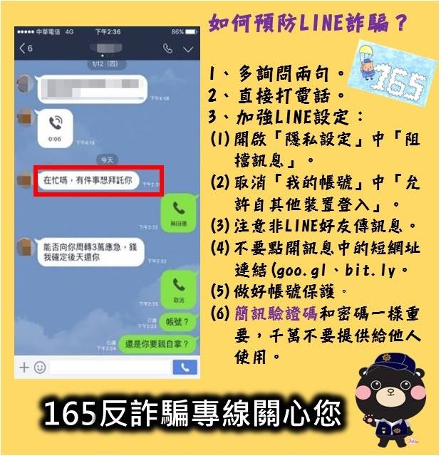 近期「盜(冒)用LINE帳號」詐騙手法頻傳,受騙民眾收 到親友傳來LINE訊息,對方稱急需用錢欲向民眾借錢,民 眾將錢匯到對方指示的銀行帳戶後,發現對方LINE帳號遭 盜用,驚覺遭詐。
