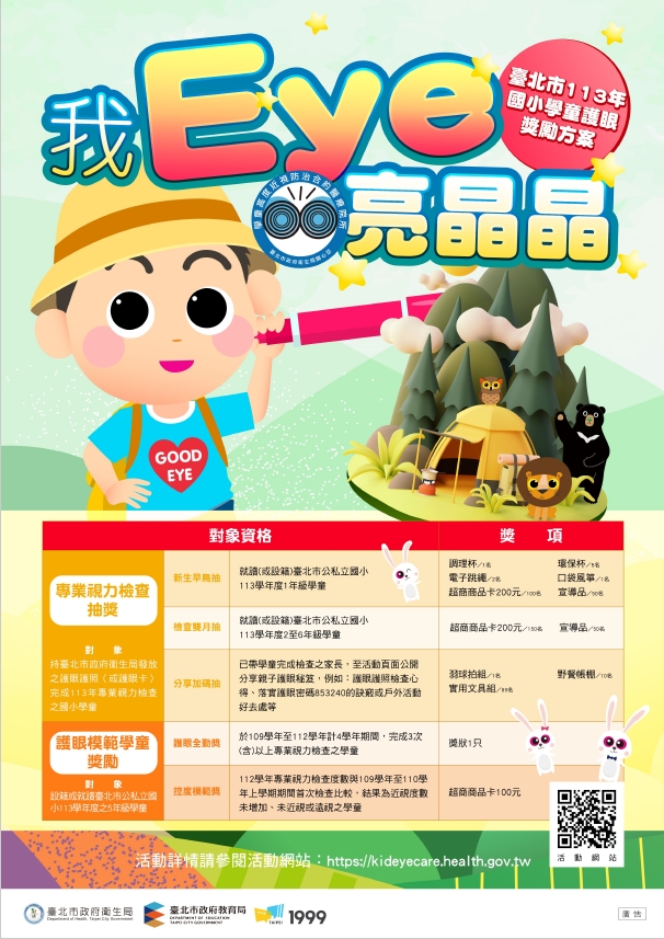 一、為鼓勵家長善用本市學童高度近視防治服務,特辦理旨揭 活動,凡持護眼護照或護眼卡完成113年度檢查之學童均符 合抽獎資格,請貴校運用多元管道及轉發班級家長LINE 群 組,鼓勵家長及早為孩子預約專業視力檢查,以掌握孩子 視力健康。