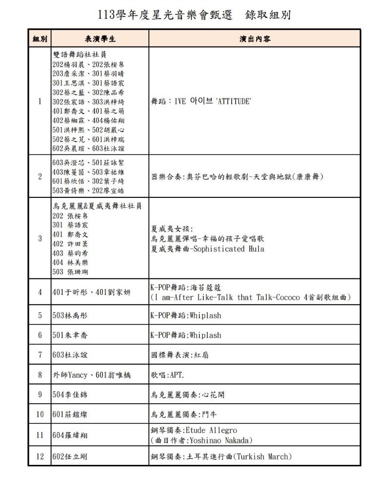 恭喜錄取者,期待5/23(五)晚上星光音樂會演出,沒錄取的表演者,不要氣餒喔,明年繼續加油!!!