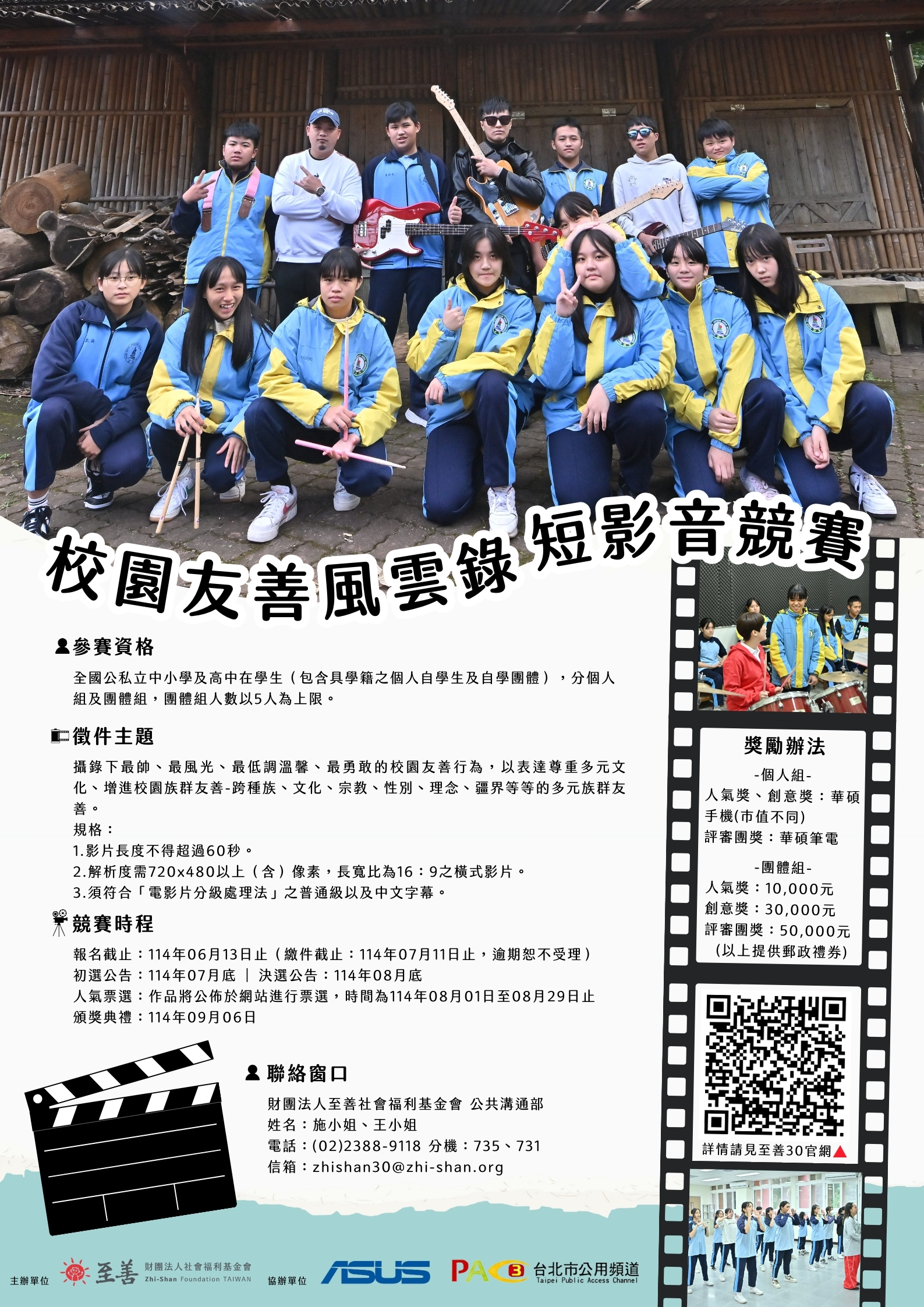 一、該基金會(官網:https://www.zhi-shan.org/)長期從事 亞洲4地兒少發展工作,為響應「兒童權利公約」(CRC) 中禁止歧視原則,自2023年起倡議「校園族群友善」,已 連續兩年舉辦校園族群友善獎。該會將辦理「校園友善風 雲錄-短影音競賽」,邀請全國國小至高中學生共同參 與,促進校園友善。
