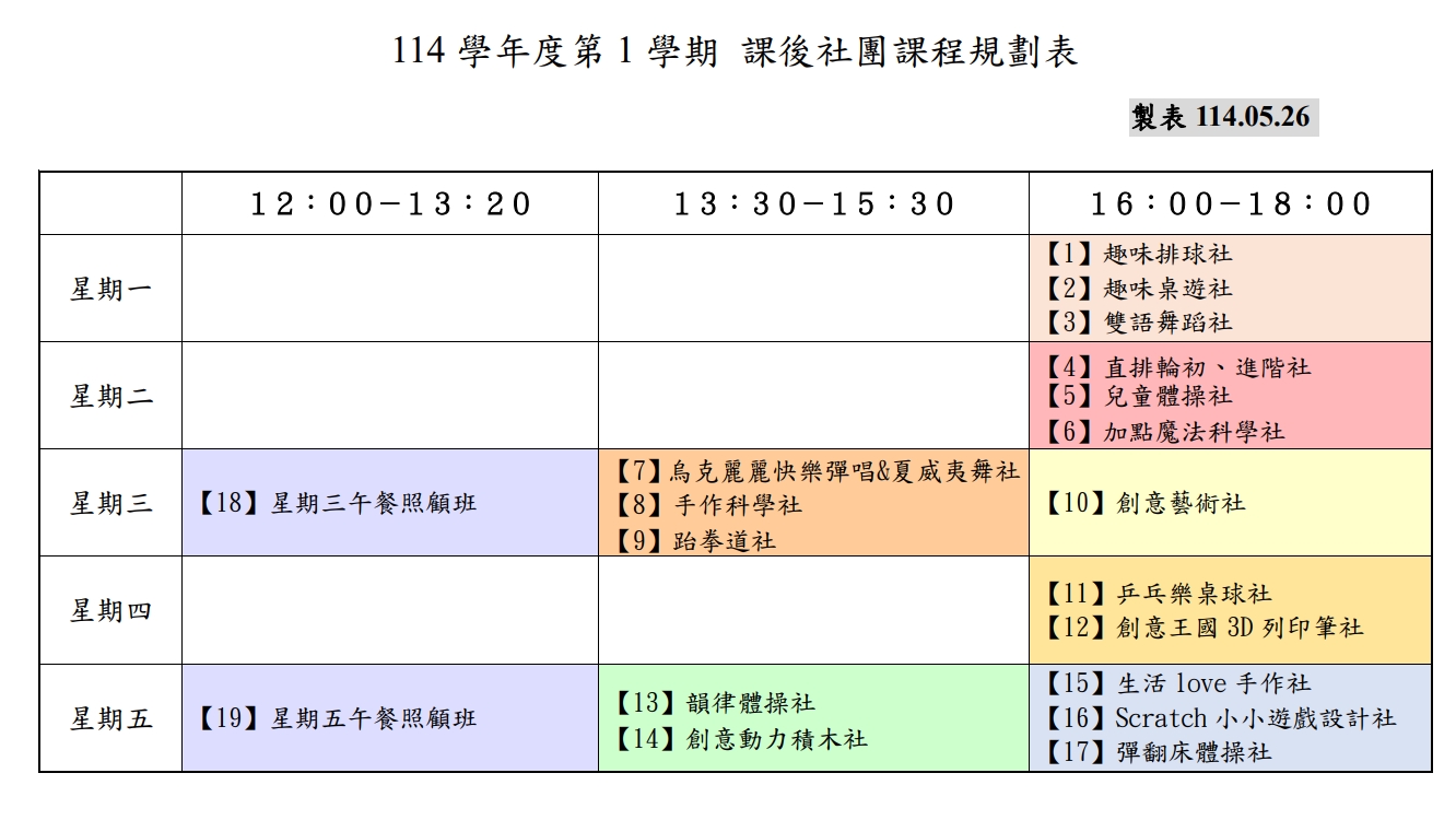 5.午餐照顧班: 星期三烏克麗麗彈唱社&夏威夷舞社、跆拳道社、科學手作及星期五韻律體操社、創意動力積木社,需再點選午餐照顧班,用餐另選午餐系統社團午餐。打擊樂團、體育班及排球小小兵,星期三用餐需填午餐照顧班及另選午餐系統社團午餐。