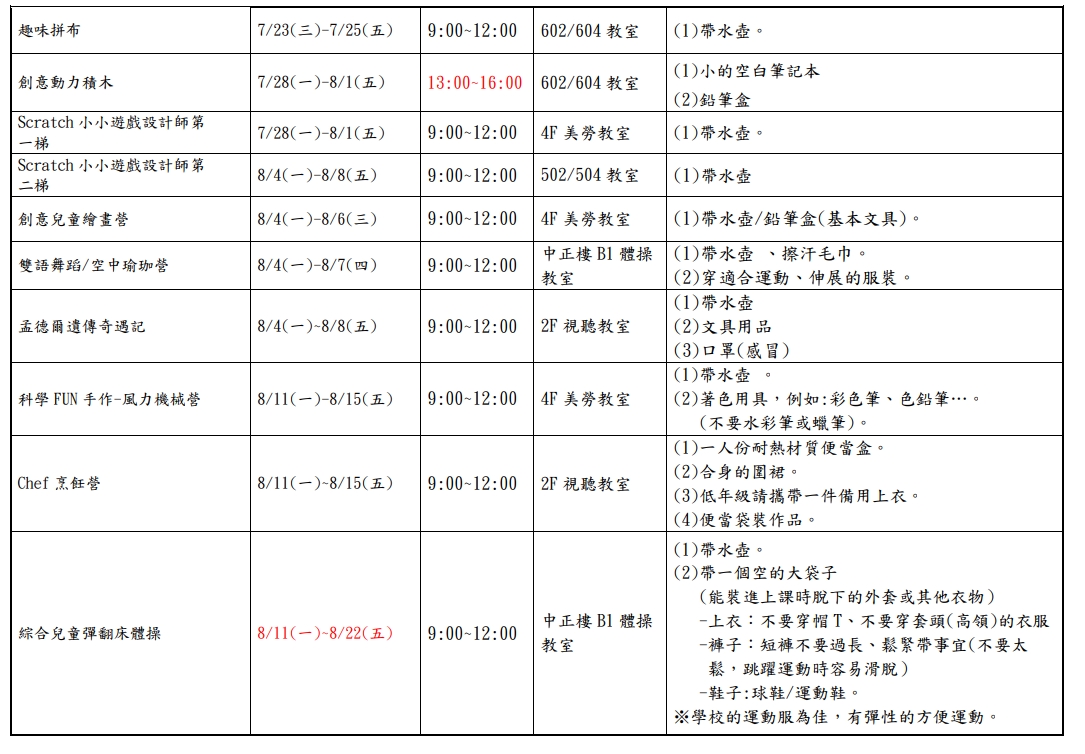 2.各營隊上課教室、攜帶或穿著提醒,如下表,教室位置為暫定,會依暑假施工狀況調整。