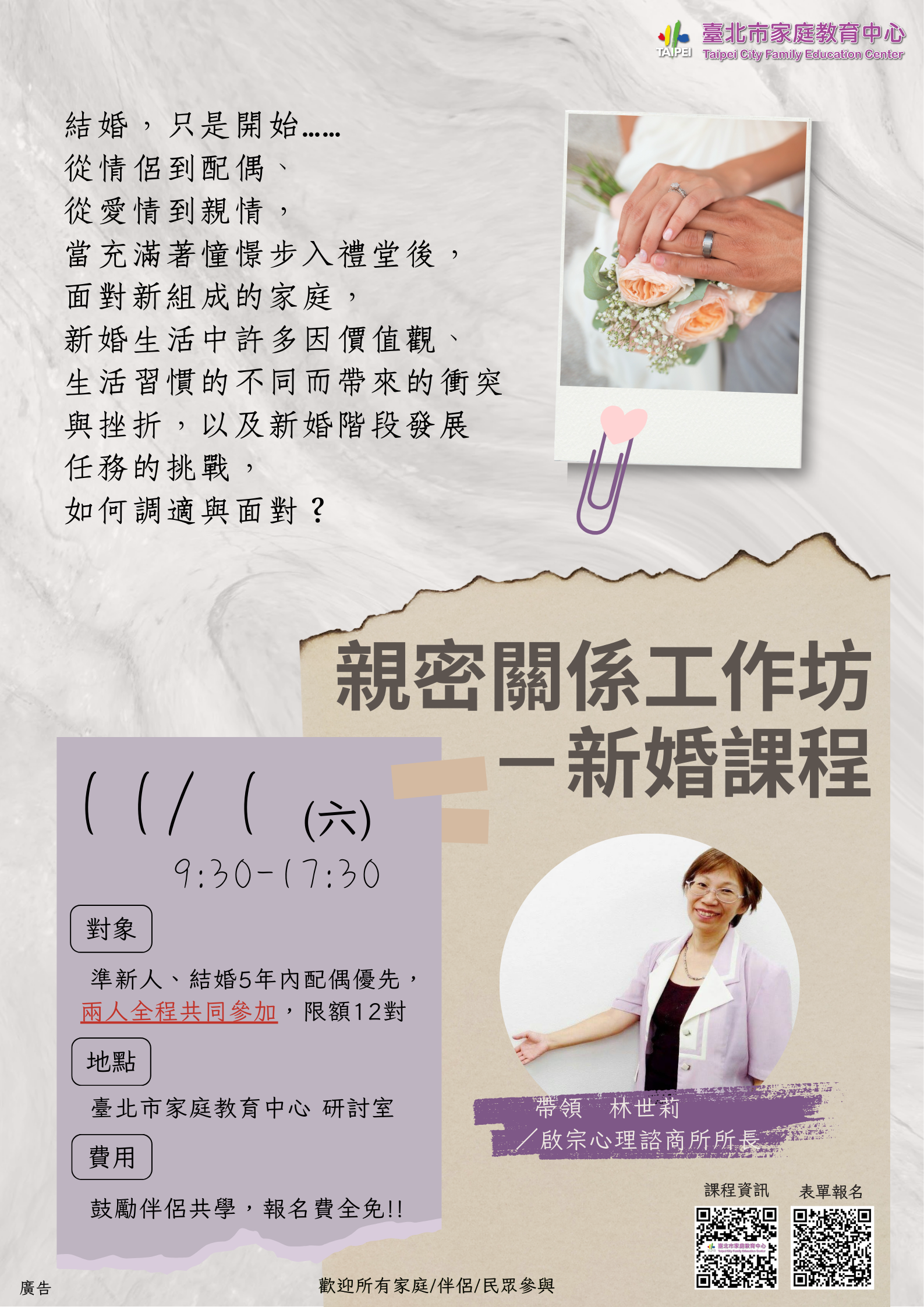 歡迎參加臺北市家庭教育中心11月1日免費課程「親密關係工作坊:學習婚姻的調適與面對!」,請至官網查詢、報名。